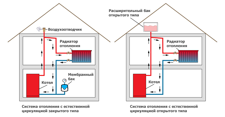 Открытые системы (гравитационные или с естественной циркуляцией) — это классика, которую часто можно встретить в старых домах или небольших дачах. Они негерметичны. Расширительный бак стоит вверху и сообщается с атмосферой.