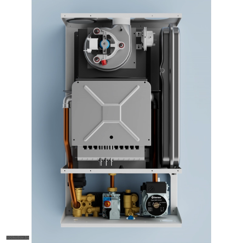 Технические характеристики• Номинальная мощность — около 24 кВт.• Камера сгорания герметичного (закрытого) типа — безопасное выделение продуктов сгорания.• Расход природного газа — ориентировочно до ~2,78 м³/ч при полной нагрузке.• Размеры корпуса примерно: высота ~700 мм, ширина ~400 мм, глубина ~260 мм; вес порядка ~32 кг.• Диаметр коаксиального дымохода порядка 60/100 мм.• Рабочее давление в контуре отопления до ~3 бар, в контуре горячей воды — до ~8 бар.