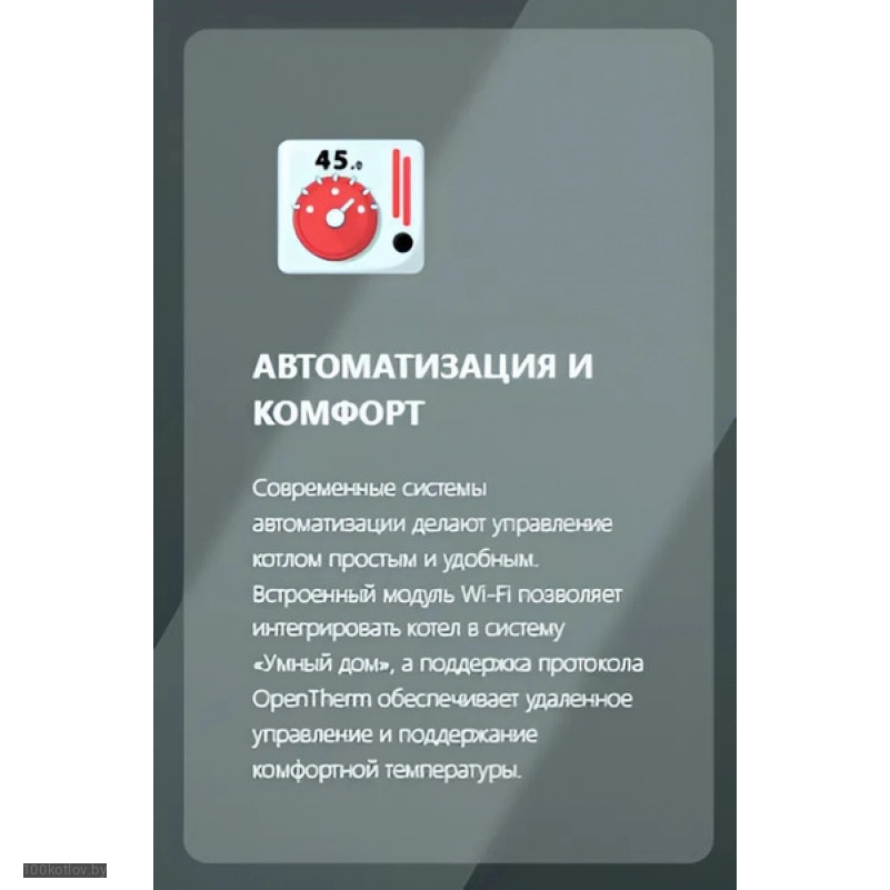 Преимущества и ключевые особенности• Настенное исполнение делает монтаж компактным и освобождает полезное пространство.• Закрытая камера сгорания гарантирует безопасный забор воздуха извне и вывод дымовых газов без контакта с помещением.• Комплекс отопления + горячая вода позволяет покрывать оба цикла с одним агрегатом — удобно и экономично.• Поддержка работы на природном и сжиженном газе расширяет возможные варианты подключения к топливу.• Современная автоматика с возможностью подключения комнатного регулятора или погодного датчика повышает эффективность.• Высокий коэффициент полезного действия снижает расход газа и делает эксплуатацию более выгодной.