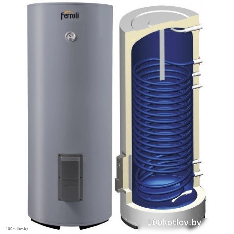 Магазин 100котлов предлагает купить Бойлер косвенного нагрева Ferroli Ecounit N 500-1C (без возможности установки ТЭНа) за наличный, безналичный расчет и в рассрочку. А также доставить и установить. Цена зависит от схемы обвязки. Весь спектр работ "под ключ".