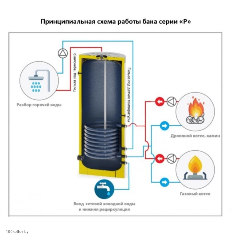 При круглогодичном использовании бака, в момент перехода на летний период, когда нет необходимости в отоплении, можно оставить бак для горячего водоснабжения от котла или теплового насоса, настроив при этом систему на поддержание температуры в баке на необходимом уровне.