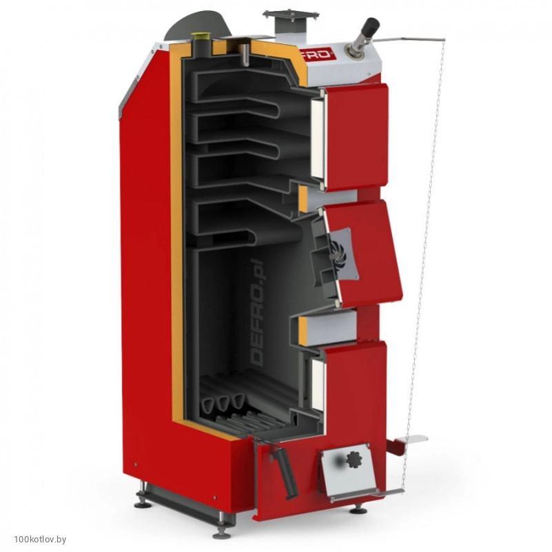 Котел отопления DEFRO имеет эффективный многоступенчатый теплообменник, выполненный из высококачественной жаропрочной стали P265GH польского завода Arcelor Mittal толщиной – 6 мм, который обеспечивает высокий тепловой КПД (до 82%). Между корпусом котла и теплообменником, а также в топочных дверцах, в качестве теплоизолятора применена минеральная каменная вата, благодаря чему человек, обслуживающий данный котел Дефро, максимально защищен от возможности получения ожогов при соприкосновении с его металлическими элементами.
