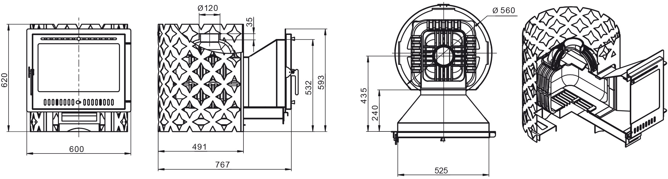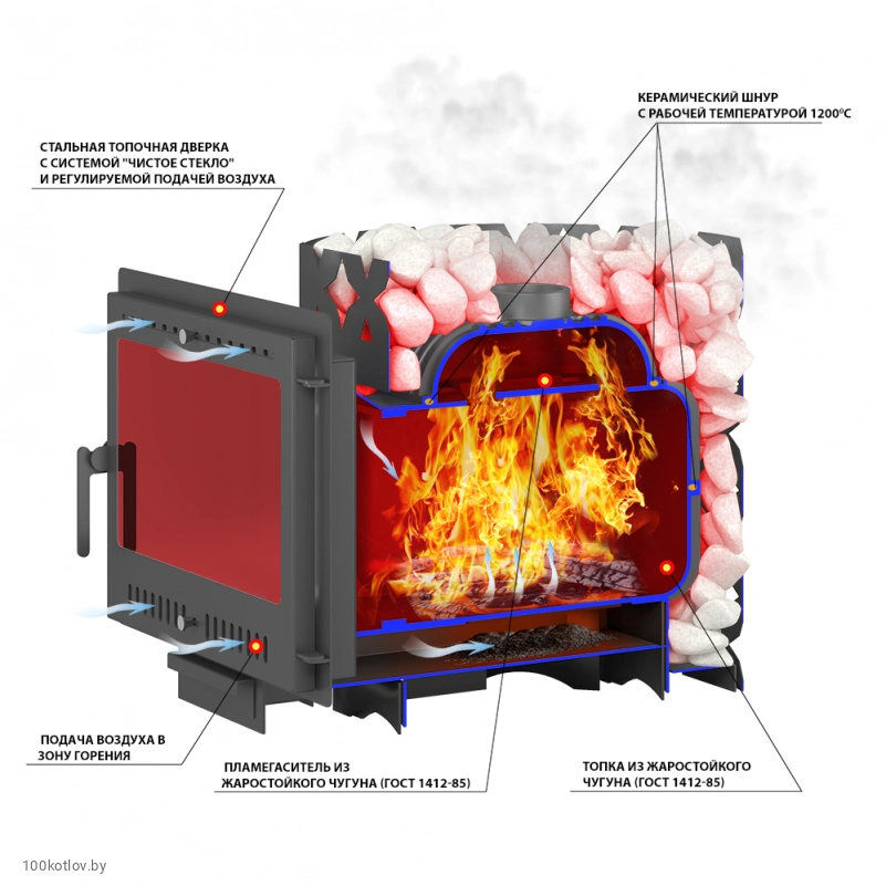 • В нижней части топочной камеры размещается чугунный колосник, предназначенный для подачи воздуха на дрова снизу.