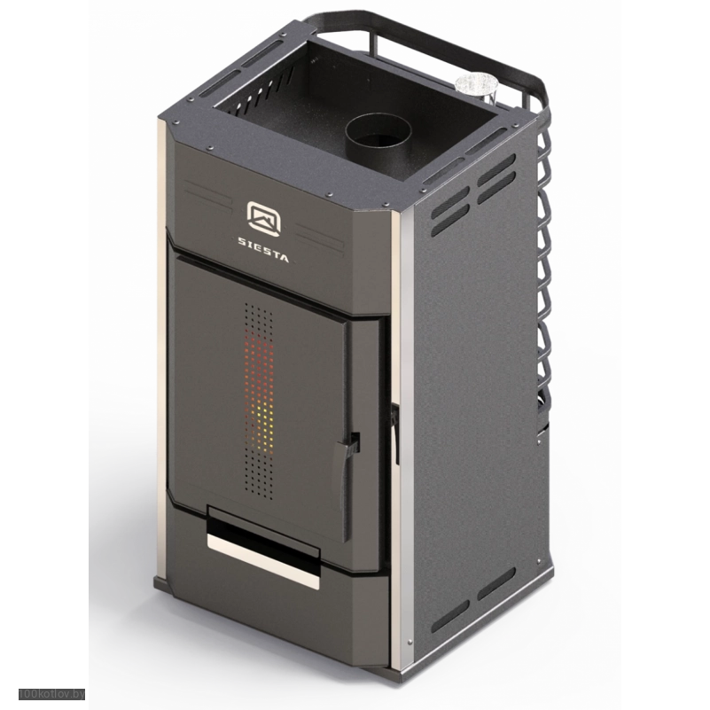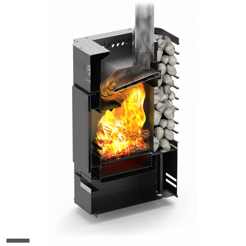 Топка сделана из нержавеющей стали и оснащена пластинками-колосниками, что способствуют равномерному и полному сжиганию топлива, а также защите дна топки от сверхвысоких температур, увеличивая долговечность и безопасность использования.
