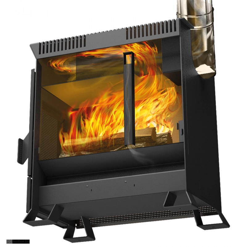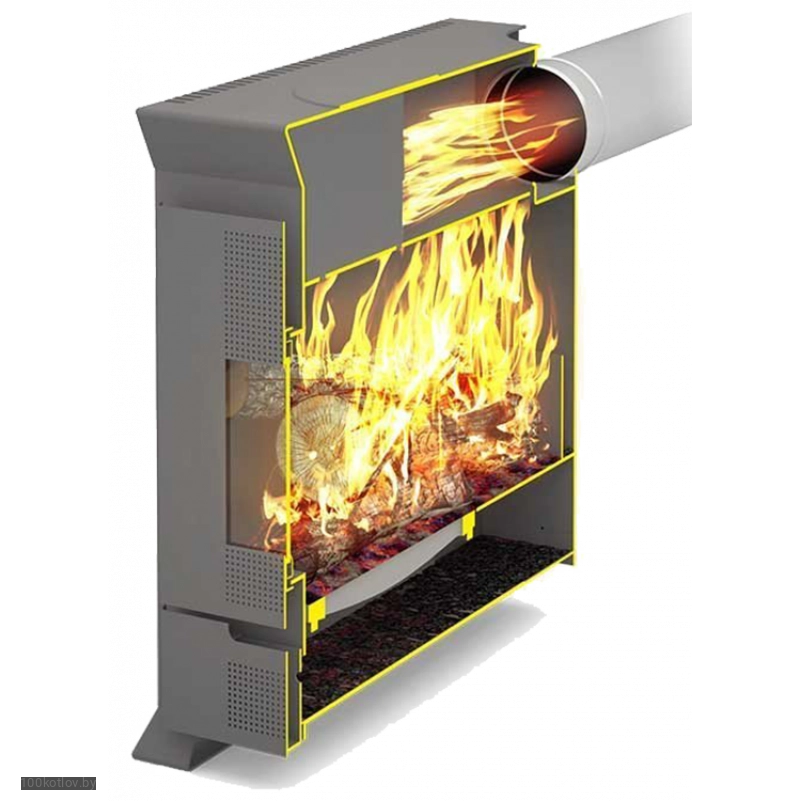 Для контроля и наблюдения за горением топлива в дверце есть стекло, а для приготовления и разогрева имеется варочная поверхность. Отсекатели и отбойники в двухоборотной топке печи поворачивают пламя, тем самым увеличивая КПД печи и уменьшают расход топлива. Наружные кожух-конвекторы создают мощные потоки воздуха и быстро нагревает отапливаемое помещение.